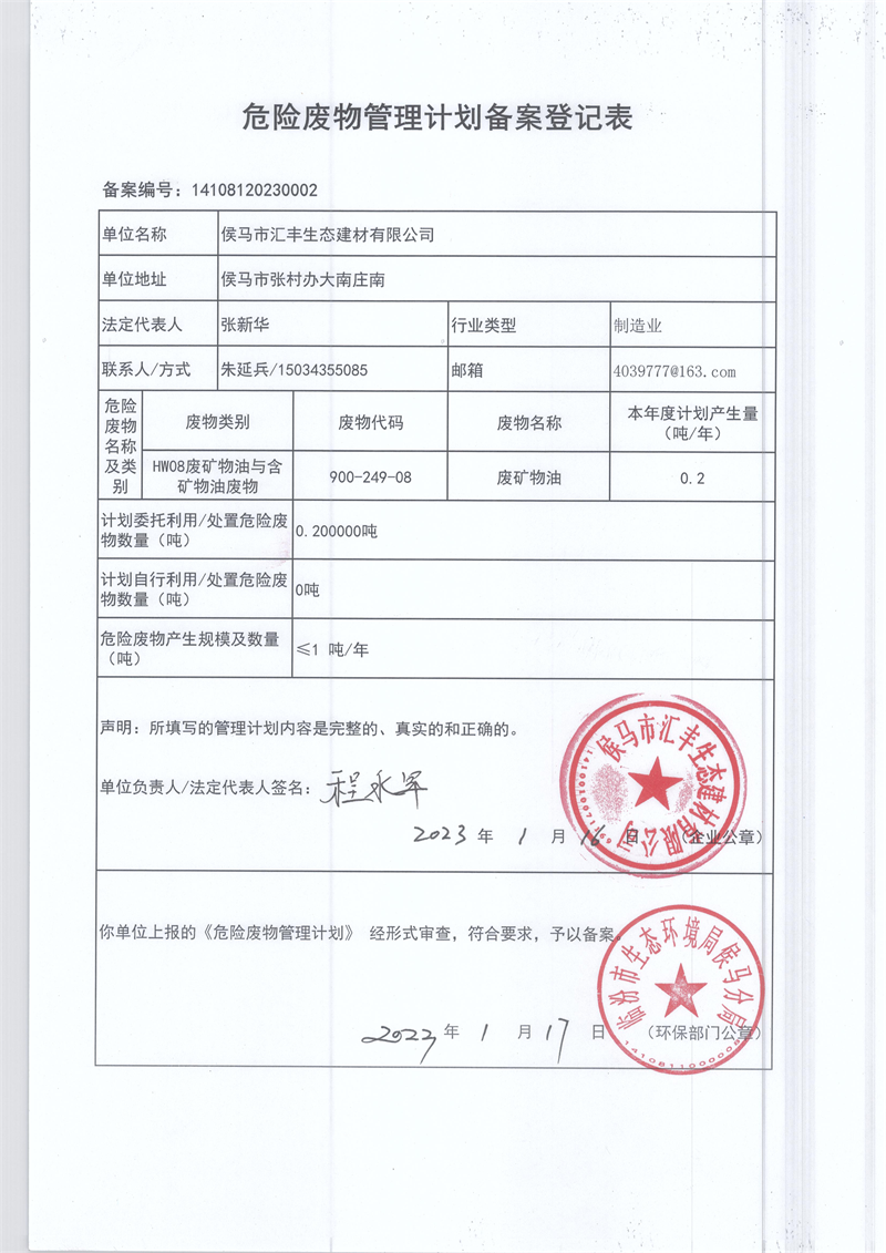 2023年危險(xiǎn)廢物管理計(jì)劃備案表(匯豐)